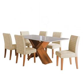 Conjunto De Mesa Sala De Jantar Tampo Com Vidro 1,80m Grécia 6 Cadeiras Creta Dobuê Madeirado / Bege