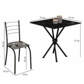 Largura Mesa: 70 cmAltura Mesa: 77 cmProfundidade Mesa: 70 cmPeso: 11,60 KgLargura Cadeira: 37 cmAltura Cadeira: 85 cmProfundidade Cadeira: 42 cmPeso: 2,48 Kg cadaGarantia: 03 MesesInformações Sobre Montagem: Não possuímos serviço de montagem.