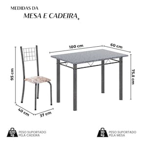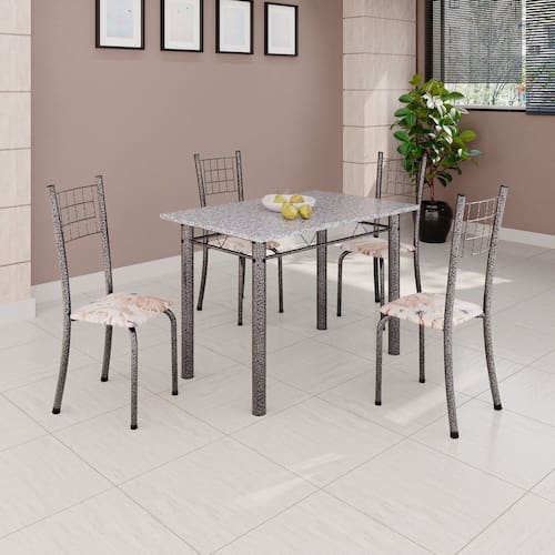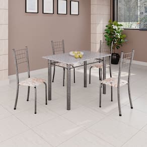 Quer deixar sua casa completa e prática? Uma dica bacana de como transformar o seu lar, deixando-o mais receptivo e bonito? Então você precisa de móveis indispensáveis para deixar seu lar muito mais aconchegante, receptivo e sempre disponível para receber a visita de amigos, familiares e convidados. Você vai se apaixonar por este incrível e moderno Conjunto de Mesa com 4 Cadeiras. Ideal para cozinha, ele é a melhor opção para completar o espaço que você desejar. Aproveite!! Medida da Mesa (A x L x P): 75,8 cm x 100 cm x 60 cm Peso da Mesa: 43,34 kg Mesa suporta até: 10.0000 Acabamento da Cadeira/Banco: Pintura Texturizada Acabamento da Mesa: Pintura Texturizada Ambiente Principal: Cozinha Cadeira/Banco Estofada: Somente Assento Estofado Cadeira/Banco estofada: Somente Assento Estofado Cadeira/Banco suporta até: 120.0000 codigo_ean: 7900288051592 Complexidade da Montagem: Baixa: pode ser montado por uma pessoa sozinha Cor: Bege / Prata Cor do Produto: Bege / Prata Cor Secundária: Bege De Canto (Canto Alemão): Não Escala de Brilho: Brilhante Espessura do Tampo: 1,5 mm Estrutura do Assento: MDP Formato do Tampo: Retangular Itens Inclusos: 1 Mesa, 4 Cadeiras, 1 Kit Ferragens + Manual de Montagem Linha ou Coleção: Dany Manual de Montagem e Instalação: https://product-hub-prd.madeiramadeira.com.br/975729/documents/3b812f8f-6765-46ba-b9df-496faad63d922645612352817375766831192.pdf Marca: Soma Móveis Material da Base da Mesa: Aço Material da Estrutura da Cadeira: Aço Material do Tampo: Granito Medida da Cadeira/Banco (A x L x P): 95 cm x 37 cm x 40 cm Medida do Tampo (L x C x E): 60 cm x 100 cm x 1,5 cm Mesa Extensível: Não Necessita Montagem: Sim Origem do Produto: Nacional Peso da Cadeira/Banco: 2,94 kg Possui Apoio Para os Pés: Não Quantidade de Cadeiras: 4 Quantidade de Lugares: 04 Recomendações de Uso, Manutenção e Limpeza: Não permitir que molhe os pés da base, usar um pano de tecido macio e seco, evitar detergentes, alvejantes e produtos químicos de limpeza; no tampo usar tecido macio levemente umedecido. Sistema de Montagem: Parafusos