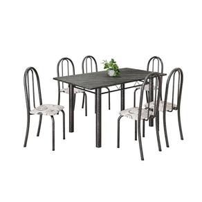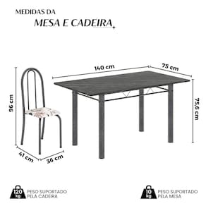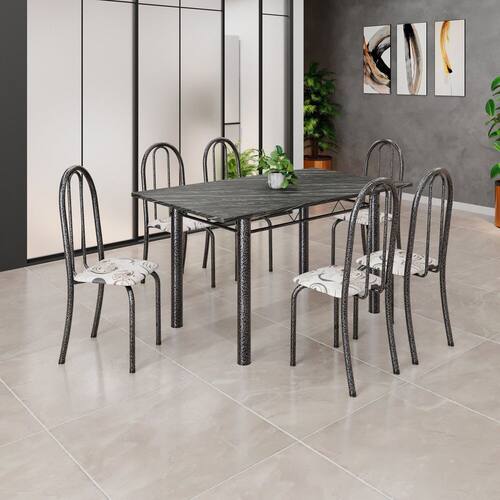 você desejar. Aproveite!! Medida da Mesa (A x L x P): 75,6 cm x 140 cm x 75cm Peso da Mesa: 54,98 kg Mesa suporta até: 10.0000 Acabamento da Cadeira/Banco: Pintura Texturizada Acabamento da Mesa: Pintura Texturizada Ambiente Principal: Sala de Jantar Cadeira/Banco estofada: Somente Assento Estofado Cadeira/Banco Estofada: Somente Assento Estofado Cadeira/Banco suporta até: 120.0000 codigo_ean: 7900288062741 Complexidade da Montagem: Baixa: pode ser montado por uma pessoa sozinha Cor: Arabesco/ Prata Cor do Produto: Arabesco/ Prata Cor Secundária: Cinza De Canto (Canto Alemão): Não Escala de Brilho: Brilhante Espessura do Tampo: 1,5 mm Estrutura do Assento: MDP Formato do Tampo: Retangular Itens Inclusos: 1 Mesa + 6 Cadeiras + 1 Kit Ferragens + Manual de Montagem Linha ou Coleção: Iris B Manual de Montagem e Instalação: https://product-hub-prd.madeiramadeira.com.br/976417/documents/36d88f22-a2cd-4648-a8ac-626e36a5ef512653848352817381021070967.pdf Marca: Soma Móveis Material da Base da Mesa: Aço Material da Estrutura da Cadeira: Aço Material do Tampo: Ardósia Medida da Base (A x L x P): 75cm x 63,5 cm x 108 cm Medida da Cadeira/Banco (A x L x P): 96 cm x 36 cm x 41 cm Medida do Tampo (L x C x E): 75 cm x 140 cm x 1,5 cm Mesa Extensível: Não Necessita Montagem: Sim Origem do Produto: Nacional Peso da Cadeira/Banco: 3,88 kg Possui Apoio Para os Pés: Não Possui Suporte Giratório: Não Quantidade de Cadeiras: 6 Quantidade de Lugares: 06 Recomendações de Uso, Manutenção e Limpeza: Não permitir que molhe os pés da base, usar um pano de tecido macio e seco, evitar detergentes, alvejantes e produtos químicos de limpeza; no tampo usar tecido macio levemente umedecido. Sistema de Montagem: Parafusos