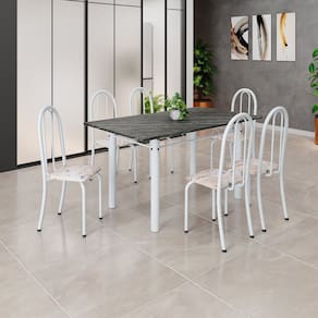 você desejar. Aproveite!! Medida da Mesa (A x L x P): 75,6 cm x 140 cm x 75cm Peso da Mesa: 54,98 kg Mesa suporta até: 10.0000 Acabamento da Cadeira/Banco: Pintura Texturizada Acabamento da Mesa: Pintura Texturizada Ambiente Principal: Sala de Jantar Cadeira/Banco estofada: Somente Assento Estofado Cadeira/Banco Estofada: Somente Assento Estofado Cadeira/Banco suporta até: 120.0000 codigo_ean: 7900288062772 Complexidade da Montagem: Baixa: pode ser montado por uma pessoa sozinha Cor: Bege / Branco Cor do Produto: Bege / Branco Cor Secundária: Bege De Canto (Canto Alemão): Não Escala de Brilho: Brilhante Espessura do Tampo: 1,5 mm Estrutura do Assento: MDP Formato do Tampo: Retangular Itens Inclusos: 1 Mesa + 6 Cadeiras + 1 Kit Ferragens + Manual de Montagem Linha ou Coleção: Iris B Manual de Montagem e Instalação: https://product-hub-prd.madeiramadeira.com.br/976420/documents/13658f8d-db91-46e8-b559-0ff49a0ff6752653848352817381021070967.pdf Marca: Soma Móveis Material da Base da Mesa: Aço Material da Estrutura da Cadeira: Aço Material do Tampo: Ardósia Medida da Base (A x L x P): 75cm x 63,5 cm x 108 cm Medida da Cadeira/Banco (A x L x P): 96 cm x 36 cm x 41 cm Medida do Tampo (L x C x E): 75 cm x 140 cm x 1,5 cm Mesa Extensível: Não Necessita Montagem: Sim Origem do Produto: Nacional Peso da Cadeira/Banco: 3,88 kg Possui Apoio Para os Pés: Não Possui Suporte Giratório: Não Quantidade de Cadeiras: 6 Quantidade de Lugares: 06 Recomendações de Uso, Manutenção e Limpeza: Não permitir que molhe os pés da base, usar um pano de tecido macio e seco, evitar detergentes, alvejantes e produtos químicos de limpeza; no tampo usar tecido macio levemente umedecido. Sistema de Montagem: Parafusos
