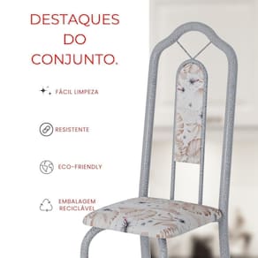 Escala de brilho: fosco Cadeira estofada com espuma D-16, revestimento em couro ecológico Medidas da Mesa (A x L x P): 75 cm x 75 cm x 180 cm Medidas da Base (A x L x P): 74 cm x 45 cm x 86 cm Medida do Tampo (L x C x E): 75 cm x 180 cm x 1,5 cm Medida da Cadeira (A x L x P): 98 cm x 40 cm x 37 cm Material da Base da Mesa: Aço Peso da Cadeira: 3,68 Kg Cadeira suporta até: 120 Kg Acabamento da Cadeira: Pintura Texturizada Material da Estrutura da Cadeira: Aço Estrutura do Encosto e Assento: MDP de 15mm c/ couríssimo Peso da Mesa: 85 Kg Acabamento da Mesa: Pintura Texturizada Mesa suporta até: 8 Kg Material do Tampo: Granito 20mm Sistema de Montagem: Parafusos Formato: Retangular