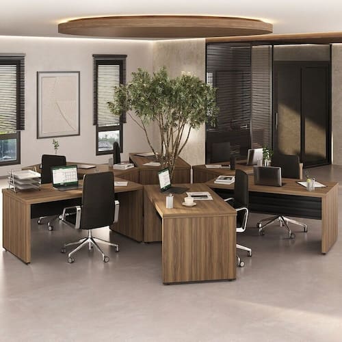Conjunto de Mesas para Escritório Tamburato 1600, projetado para acomodar 6 pessoas com conforto e praticidade. Possui tampo e pés em Tamburato de 50 mm de espessura, garantindo resistência e durabilidade, aliado a um design moderno que valoriza qualquer ambiente corporativo.