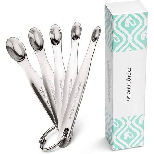 . QUANDO PEQUENAS QUANTIDADES IMPORTAM, procure este conjunto incrivelmente bonito de mini colheres de medição por MorgenhaanACCURATE MEASUREMENT: Conjunto de cinco colheres de metal nos seguintes tamanhos: Tad (1/4 colher de chá ou 1,25 milímetros), Dash (1/8 tsp ou 0,63ml), Pinch (1/16 tsp ou 0,3125ml), Smidgen (1/32 tsp ou 0,156ml), Drop (1/64 tsp ou 0,078ml)ACABAMENTO LISO ATRAENTE: O polonês liso de cetim faz dessas colheres de medição em miniatura um prazer de usar e olhar. Alça larga torna o manuseio confortável e cuidadoso de seus ingredientes importantesDESIGNED FOR DAILY USE: Nem todo aço inoxidável é feito da mesma forma! Fazemos nossas mini colheres com o mesmo aço inoxidável 18/8 304 para fazer nossos conjuntos de medição maiores. Experimente o mesmo artesanato que ferramentas profissionais projetadas para cozinhas comerciaisOUR ROCK SOLID GUARANTEE: Muitas vezes, bons produtos que funcionam bem não duram ou produtos que parecem bons não são realmente úteis. Em Morgenhaan, não aceitamos esse compromisso. Somos obcecados pela qualidade e acreditamos que as ferramentas de cozinha podem ser bonitas, funcionar bem e durar muito tempo. Se ficarmos aquém disso, basta entrar em contato com nosso amigável Atendimento ao Cliente para um reembolso de 100% sem barulho