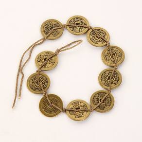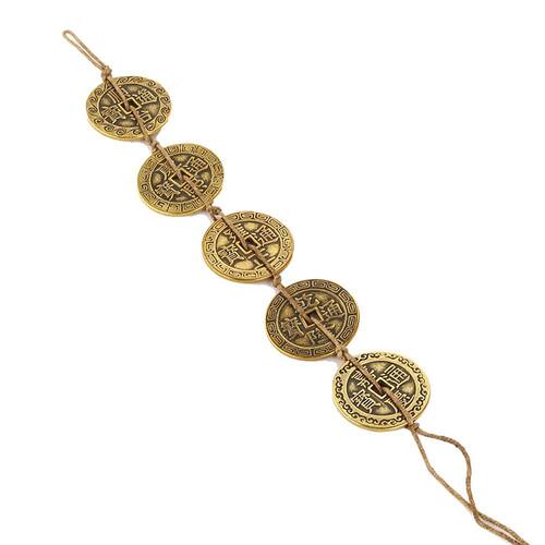 Material: cobre Peso: 10 g Tamanho: 2,5 cm Embalagem: 5 moedas Simbolismo tradicional do Feng Shui — Apresenta dez moedas do imperador chinês de estilo antigo amarradas com corda natural, simbolizando riqueza e proteção. Construção em latão premium — Feita de cobre durável com acabamento envelhecido, garantindo um charme cultural duradouro. Peça decorativa artesanal — Cada moeda é minuciosamente detalhada com inscrições históricas chinesas para uma aparência autêntica. Traz sorte e prosperidade — Ideal para pendurar em portas, paredes ou escritórios para atrair energia positiva e sucesso financeiro. Decoração cultural versátil — perfeita para ambientes domésticos, de escritório ou de negócios, adicionando um toque elegante da herança tradicional chinesa.