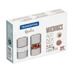 Conjunto De Moedores Para Sal E Pimenta Tramontina Realce Em Aço Inox E Acrílico Com Moinho Em Cerâm Tramontina Conjunto de Moedores para Sal e Pimenta Tramontina Realce em Aço Inox e Acrílico com Moinho em Cerâmica 2 Peças Tramontina - Acrescente mais sabor aos seus pratos, com o Conjunto de Moedores para Sal e Pimenta Tramontina Realce em Aço Inox e Acrílico com Moinho em Cerâmica. Os itens são perfeitos para compor a mesa e trazer ainda mais gosto às suas refeições. As peças apresentam alta resistência e proporciona maior durabilidade, além disso, seu acabamento em acrílico permite visualizar o interior do conteúdo. O melhor de tudo é o seu sistema de moagem pré-definida, que traz mais facilidade e eficiência na utilização. É a Tramontina trazendo muito mais praticidade ao seu dia a dia!Possui moedores de alta resistência, proporcionando maior durabilidade. Por ser em acrílico, facilita a visualização do produto contido em seu interior. Possui sistema de moagem pré-definida. Ideais para o uso em mesas de hotéis e restaurantes. Material: acrílico + aço inox. Moedores de cerâmica. Compartimento de acrílico. Tampa de aço inox. Capacidade: Sal grosso = 10g Pimenta = 4gObservaçõesPara abastecer: remova a tampa do compartimento de grãos (puxando-a) e adicione o grão a ser moído. Para moer: com uma das mãos, segure o compartimento de grãos, e com a outra gire a tampa no sentido horário para moer. USO SEGURO E ADEQUADO: Tenha cuidado ao manusear o produto, pois ele poderá quebrar ao sofrer quedas ou impactos. Ao usar o moedor com sal em ambientes muito úmidos, ele poderá não funcionar adequadamente; e então recomendamos trocar ou secar o sal. Não lavar o moedor; para limpeza, use um pano úmido na parte externa. Para descarte dos produtos e embalagens, siga as orientações de reciclagem vigentes.Características GeraisEAN137891116157848DUN1417891116157845NCM8210.00.10Peso Líquido0,0400 kg.Peso Bruto0,0600 kg.Metragem0,000346 m.Dimensões Embalagem (Compr. X Larg. X Alt.)120x 80x 36 mm.Dimensões Produto (Compr. X Larg. X Alt.)120x 80x 36 mm. Características Gerais do Produto: Garantia: - 1 Ano