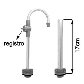 Conj. Controle do nível do viveiro - 17cm Bujão para controle do nível d'água do viveiro, produzido em plástico com tubos em alumínio, possui registro para bloquear e liberar a entrada de água no viveiro. Mantém aproximadamente o nível de 17 cm de água no viveiro.