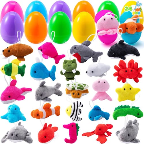 - Supervalor com 24 ovos de Páscoa pré-preenchidos com 24 mini animais marinhos fofos diferentes de pelúcia com cores diversas vívidas. Nenhum é duplicado! Os ovos medem 7,6 cm.