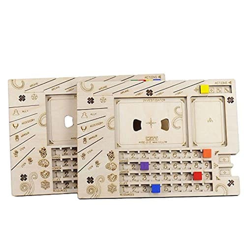 - Acompanhe suas Ações, Saúde, Sanidade, Pistas e Recursos no tabuleiro com nossos cubos de madeira em cinco cores.