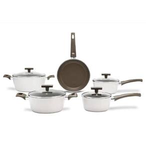 O conjunto é fabricado na cor Nata e com cabos/alças na cor Marrom, que garantem o manuseio com segurança, e traz sofisticação com uma estrutura em alumínio, que cozinha por igual e mais rápido, distribuindo o calor de forma homogênia.