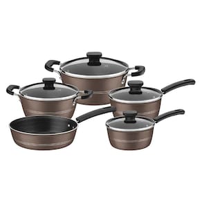 O Jogo de Panelas Tramontina Sicília em Alumínio com Revestimento Interno e Externo Antiaderente Starflon Excellent Avelã 5 Peças vai garantir uma cozinha equipada com utensílios de alta qualidade e eficiência! Suas peças são produzida em alumínio com revestimento interno e externo de antiaderente Starflon Excellent, características que proporcionam o cozimento uniforme dos alimentos, evita que eles grudem em sua superfície e as torna mais duráveis. Suas panelas e caçarolas vem com tampa de vidro temperado com saída de vapor e borda de aço inox e seus cabos, alças e pegadores são em material antitérmico e garantem um manuseio muito mais confortável e seguro. Elas ainda são fáceis de limpar e podem ir à máquina de lavar louças, otimizando sua rotina na cozinha!Recomendações: Antes do primeiro uso, lave com esponja macia, sabão neutro ou detergente líquido. Evite manchas não escorrendo gordura e alimentos na área externa da peça. O preparo de molhos e alimentos com forte pigmentação pode causar alteração na cor do revestimento interno. Limpeza: Evite a imersão do utensílio quente em água fria. Nunca utilize produtos abrasivos na lavagem. Para descarte dos produtos e embalagens siga as orientações de reciclagem vigentes. Este produto não necessita de manutenção, apenas limpeza. Conteúdo do jogo: 1 Panela 16 cm 1.3 litros 1 Panela 18 cm 1.9 litros 1 Caçarola 24 cm 4.3 litros1 Caçarola 20 cm 2.4 litros 1 Frigideira funda 24 cm 2.5 litros