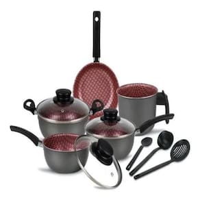 01- panela de 16cm de diâmetro 01- panela de 18cm 01- caçarola de 18cm 01- fervedor de 14cm 01- frigideira de 20cm 01- espátula 01- pegador de macarrão 01- colher grande