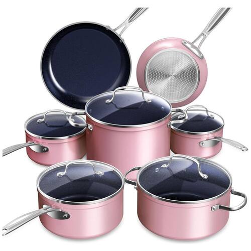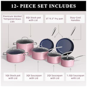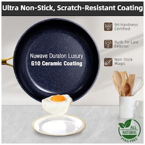 Este conjunto de panelas premium é construído com forjamento, tornando o forte e durável, mas ainda leve e fácil de manusear. O revestimento saudável Duralon Blue é um revestimento cerâmico totalmente natural, livre de produtos químicos nocivos como PTFE, PFOA, grafite e cádmio, e não emite gases tóxicos em temperaturas mais altas. A cerâmica Geração 10 G10 é excepcional em todas as categorias, aquecendo rapidamente e liberando alimentos uniformemente sem esforço, além de ser extraordinariamente durável. A dureza do revestimento é avaliada em 9H, tornando o extremamente forte e resistente à abrasão, corrosão e ácido, o que significa que não lascará ou descolorirá e manterá suas propriedades antiaderentes por mais tempo. Cada panela é colada e reforçada com placa SS anti deformação na parte inferior para torná la pronta para indução, proporcionando distribuição de calor rápida e uniforme e retenção superior de calor em qualquer temperatura. Além disso, cada peça do conjunto de panelas é segura para uso em todos os cooktops, incluindo fogões elétricos e a gás, e pode ir ao forno até 500F para uma transição perfeita do fogão para o forno. As tampas premium resistentes a estilhaços incluídas neste conjunto incluem uma pequena abertura de ventilação para garantir que o vapor seja liberado com segurança enquanto você cozinha. As tampas são projetadas para caber em cada peça do conjunto de panelas para um cozimento mais conveniente. Este conjunto inclui uma panela de 4,66 litros com tampa, uma panela de 1,87 litros com tampa, uma panela de 2,80 litros com tampa, um caldeirão de 4,66 litros com tampa, uma panela de 7,46 litros com tampa, uma frigideira de 8 polegadas e uma frigideira de 9,5 polegadas. Cada peça é tratada com o revolucionário revestimento cerâmico Duralon Blue.
