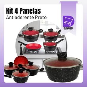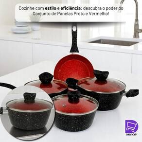 Conjunto de Panelas Antiaderente com Tampa de Vidro 04 Peças em Alumínio Preto e Vermelho para Uso Doméstico