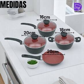 Composição do conjunto: 1 caçarola, 2 panelas e 1 frigideira