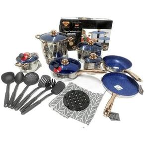 23 peças 9 camadas de cerâmica em aço cirúrgico 18/10 gramaturata termosto 2 Frigideiras 4 Panelas 1 Fritadeira 5 Tampas 6 Colheres 1 Grau de fritadeira 1 Avental 2 Dois puxador 1 Porta panela