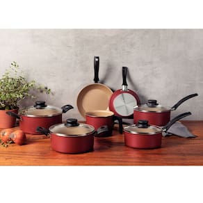 O Conjunto de Panelas Antiaderente Tramontina Turim Vermelho 7 Peças é a escolha ideal para quem busca uma cozinha completa e preparada para o preparo das suas refeições. Composto por 7 peças, esse jogo de panelas é fabricado em alumínio com revestimento in terno e externo em antiaderente Starflon Max vermelho, que oferece tudo o que você precisa para garantir um arroz soltinho, um refog ado de legumes perfeito ou um bife grelhado suculento, de maneira rápida e uniforme, sem grudar na superfície. Além disso, não gruda , é fácil de limpar e mais durável, proporcionando uma experiência culinária de alta qualidade. O melhor de tudo é que esse revestim ento é livre de PFOA, ou seja, não é prejudicial à saúde.Para sua comodidade, o conjunto possui tampas de vidro temperado co m bordas de aço inox, permitindo que você acompanhe o cozimento dos alimentos sem precisar abrir as panelas. Os cabos, alças e pegad ores são fabricados em materiais antitérmicos, garantindo que eles não aqueçam durante o uso e proporcionando maior segurança no man useio. Além da praticidade na cozinha, a limpeza também é facilitada, pois esse conjunto de panelas pode ser levado à máquina de lav ar louças, tornando o seu dia a dia mais fácil e descomplicado. Invista no Conjunto de Panelas Antiaderente Tramontina Turim Vermelho 7 Peças e tenha uma cozinha completa e preparada para todas as suas necessidades culinárias. Com sua alta qualidade, durab ilidade e praticidade, ele se tornará um aliado indispensável no seu dia a dia na cozinha. Não perca tempo e adquira agora mesmo ess e conjunto de panelas que vai transformar suas receitas em verdadeiras obras de arte gastronômicas.Dicas de Uso e Conserv açãoA capacidade volumétrica máxima para cozimento é de 3/4 da capacidade total da peça. Para obter os melhores resultad os, é recomendado posicionar os cabos dos utensílios voltados ao centro do fogão. Em fogões com grade, centralize as peças sobre a c hama ou fonte de calor e alinhe os cabos com a grade.