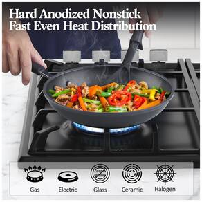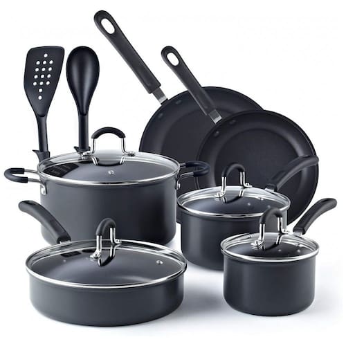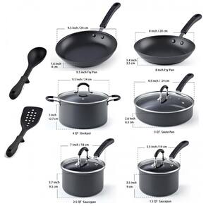 Inclui panelas de 1.4L e 2.3L, panela de caldo de 5.6L, frigideira de 2.8L com tampas, frigideiras de 20, 22 e . E uma espátula de náilon e colher Tem uma superfície anodizada dura que é durável , espessa, aquece uniformemente , rapidamente e evita pontos quentes Desempenho antiaderente para fácil liberação , lançamento de alimentos, limpeza e permite uma culinária saudável Tampas de vidro temperado para ver os alimentos e tampas que cabem em frigideiras alças rebitadas são confortáveis , manter a calma Funciona a gás, elétrico, vidro, cerâmica, halogênio, etc Não compatível com indução Forno para 176C