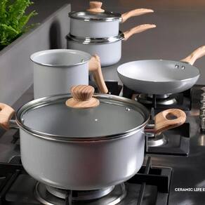 O conjunto de panelas Ceramic Life Easy 5 peças brinox smart plus ceramic life é um jogo de utensílios domésticos que oferece durabilidade, beleza e praticidade hora de cozinhar. As panelas são feitas de alumínio com revestimento cerâmico antiaderente, que não libera metais pesados e elementos químicos no alimento. Elas também possuem tampas de vidro temperado com saída de vapor e alças e cabos em soft-touch antitérmico, que não esquentam e garantem um manuseio seguro e confortável. Além disso, elas são resistentes a altas temperaturas e podem ser usadas em fogões a gás, elétricos e vitrocerâmicos.