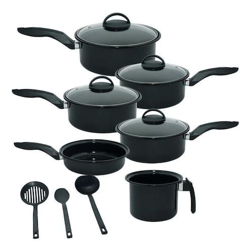 DescriçãoConjunto de Panelas 9 Peças Aço Fundido com Cerâmica e Tampa de Vidro inquebrável Preta - RoyaleSua Cozinha merece produtos de alta QualidadeO Conjunto possui revestimento especial em vitro cerâmica, confeccionada para resistir as altas temperaturas e evitar contaminação por germes e bactérias.Cozinha eficientemente e mantém o calor economizando até 40% do gás.Fácil de Limpar e permanecem bonitas por mais tempo.Material: Aço Ferromagnético Fundido a 850.C com Cerâmica de Alta Qualidade.Pode ser levado ao Freezer, Lava Louças, Fogão A Gás, Elétrico, por Indução e a Lenha.Composição:1 panela com tampa de vidro 221 Panela com tampa de vidro 201 Panela com tampa de vidro 181 panela com tampa de vidro 161 Frigideira 221 Leiteira 163 escumadeirasCaracterísticasAmbiente: CozinhaModelo / Tipo: Conjunto de PanelasMaterial: Aço, CerâmicaCor: PretoCabo: BaquelitePeso: 4,5kgTipo de Uso: Dia a DiaQuantidade de Peças: 9Garantia: Defeito de Fabricação