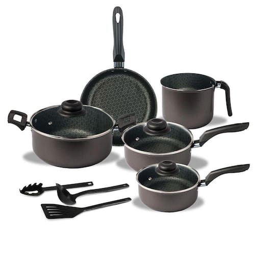 Composição do conjunto: - 01 Panela com diâmetro de 16 cm - 01 Panela com diâmetro de 18 cm - 01 Caçarola com diâmetro de 18 cm - 01 Frigideira com diâmetro de 18 cm - 01 Fervedor com diâmetro de 14 cm - 01 Espátula de nylon - 01 Colher de nylon - 01 Concha de nylon