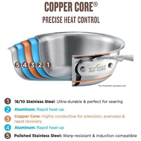 O conjunto inclui frigideira de , panela de molho de 2 litros com tampa, frigideira de 3 litros com tampa e panela de 8 litros com tampa Construção colada de 5 camadas com aço inoxidável, alumínio e um núcleo de cobre espesso para aquecimento rápido e uniforme, resistência sem deformação e capacidade de resposta máxima A superfície de cozimento em aço inoxidável altamente polida oferece resistência superior à aderência para fácil manutenção com bordas alargadas para derramar sem gotejamento Alças de aço inoxidável mais longas e rebitadas, contornadas para uma aderência confortável e ventiladas para se manterem frescas com tampas de aço inoxidável para combinar Compatível com todos os cooktops, incluindo indução, e para forno e frangos de corte até 315 C
