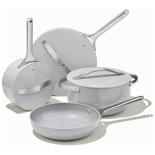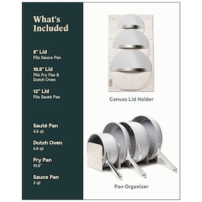 NATURALMENTE ANTIADERENTE Nossas panelas e frigideiras antiaderentes super lisas exigem menos óleo ou manteiga para cozinhar e esfregar o mínimo para uma limpeza impecável, proporcionando uma experiência culinária mais saudável e fácil em casa. REVESTIMENTO NÃO TÓXICO Todos os conjuntos de panelas e frigideiras Caraway são livres de PTFE, PFOA, PFAS, grafite, cádmio e outros materiais tóxicos que podem entrar em sua comida, tornando os s para você, sua família e o meio ambiente. Este conjunto de panelas e frigideiras é feito para qualquer cozinha e fogão. Eles podem ser s efetivamente em fogões de indução, a gás e elétricos e são s para forno até 287 C, tornando os ótimos para assar pão e assados. O QUE ESTÁ NA CAIXA Incluído neste conjunto de panelas de 12 peças está uma frigideira de , 3 litros. panela de molho com tampa, 6,5 litros. forno holandês com tampa, 4,5 litros, sauté pan com tampa, 4 racks magnéticos modulares para panelas e um suporte de tampa de lona com ganchos Marca: Não Informado