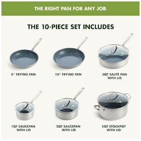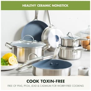 Este conjunto inclui 8 e 10 frigideiras, caçarolas de 0,93 litros e 1,87 litros com tampa, frigideira de 2,80 litros com tampa, caldeirão de 4,66 litros com tampa e esponja Renew. Seguro para utensílios de metal, o revestimento antiaderente autêntico da GreenPans com infusão de diamante oferece durabilidade notável, aquecimento equilibrado e limpeza sem esforço. O revestimento antiaderente de cerâmica saudável GreenPans Thermolon TOXINFREE é livre de PFAS, PFOA, grafite e cádmio para refeições sem preocupações. A construção ultrarresistente e a base encapsulada proporcionam excelente transferência de calor e durabilidade duradoura.