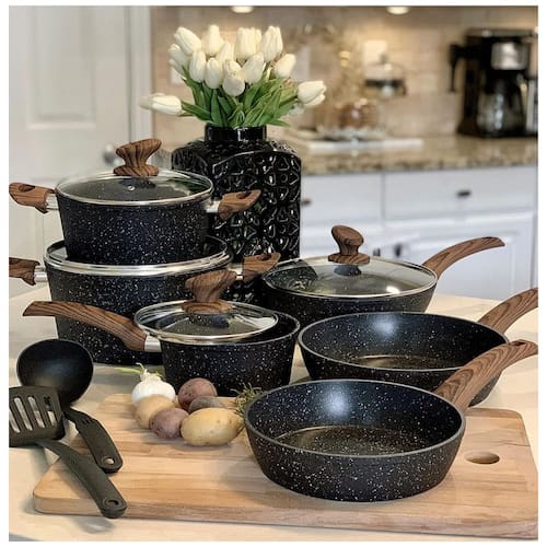 Conjunto de panelas e frigideiras antiaderentes Ao comprar panelas, uma das coisas importantes é a capacidade antiaderente. O revestimento de granito faz um bom trabalho para evitar que os alimentos grudem. Além disso, você poderá cozinhar refeições mais saudáveis para sua família, pois não precisará usar tanto óleo. Você pode cozinhar molho de tomate com segurança em panelas de granito, o sabor e o cheiro da sua comida não mudarão mesmo se você usar ingredientes ácidos ou com cheiro forte. Máquina de lavar louça segura. Fácil de limpar e lavar à mão recomendo Conjunto de cozinha sem toxinas Ao comprar um conjunto, certifique se de que indica claramente que é livre de grafite, sem PFOA. Estas são as três coisas que você don t deseja ter em suas panelas por causa de seus potenciais perigos para a saúde. Felizmente, você pode obter panelas de granito livres desses produtos químicos nocivos Conjuntos de panelas de indução No que diz respeito ao interior, esta panela usa um núcleo de alumínio. O resultado é que a panela aquece rapidamente e, mais importante, distribui o calor uniformemente. O conjunto de panelas funciona em todos os principais tipos de cooktops, mesmo indução. Sear carne, refogar ou até mesmo usá lo como wok para fritar arroz Marca: Não Informado