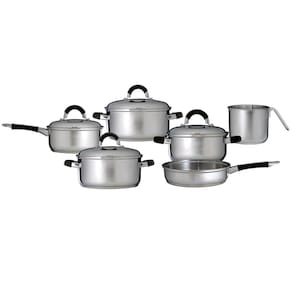 Nele você encontra uma panela de 16 centímetros, uma caçarola de 18 centímetros, outra caçarola com 20 centímetros e mais uma caçarola com 22 centímetros, todas elas equipadas com uma tampa de mesmo tamanho. Há ainda uma excelente frigideira e um ótimo fervedor, de 22 e 14 centímetros, respectivamente.