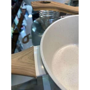 Super lançamento 2022 a Mimo Style empresa já consolidada no seguimento de utilidades doméstica a Mimo Style inova mais vez e traz esse lindo e arrojado conjunto de panelas Marmol na cor creme marmorizada com cabos que imitam madeira .