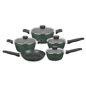 - O conjunto inclui uma panela de 16cm, uma panela de 18cm, uma caçarola de 20cm, uma caçarola de 22cm e uma frigideira de 22cm.