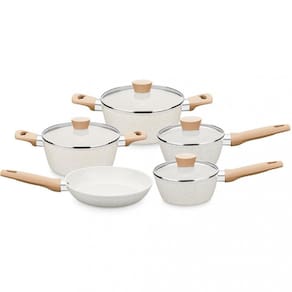 Características: Composto por cinco peças Material Alumínio forjado e Ceramic flon Tampas em vidro temperado Cabos ergonômicos Revestimento antiaderente