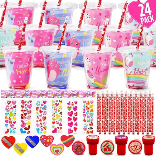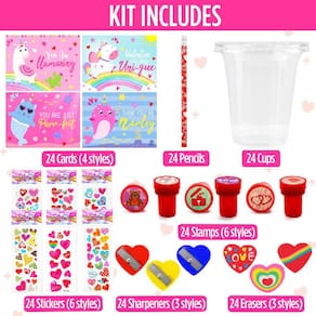 - O conjunto de papelaria do Dia dos Namorados inclui 24 xícaras, 24 lápis, 24 cartões, 24 adesivos, 24 carimbos, 24 apontadores e 24 borrachas. Total de 168 peças.
