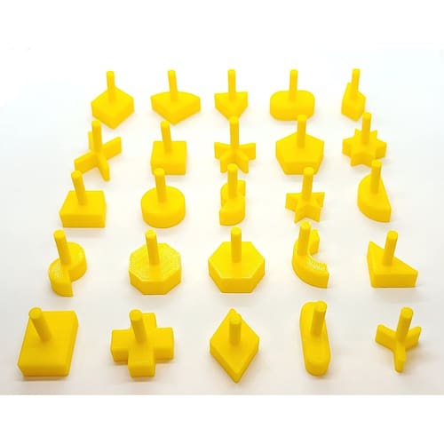 Jogo de tabuleiro Perfection conjunto completo de peças de substituição e formas de pinos. O tabuleiro de jogo em si não está incluído, apenas as peças de substituição conforme mostrado nas fotos. - Conjunto completo de 25 peças de reposição amarelas - Serve na versão autêntico do jogo Perfection - Ajuste perfeito! - Bolsa de armazenamento reutilizável - O tempo está passando – bata o relógio antes que as peças apareçam!