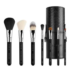 Conjunto de pincéis de maquiagem Sigma Beauty Travel — Pincéis de maquiagem de viagem com fibras premium e alças elegantes e duráveis para rosto e olhos, inclui 7 pincéis de maquiagem pretos e um copo de pincel de maquiagem