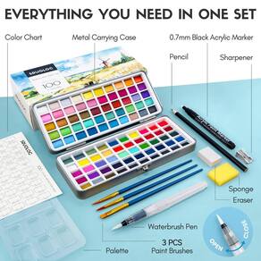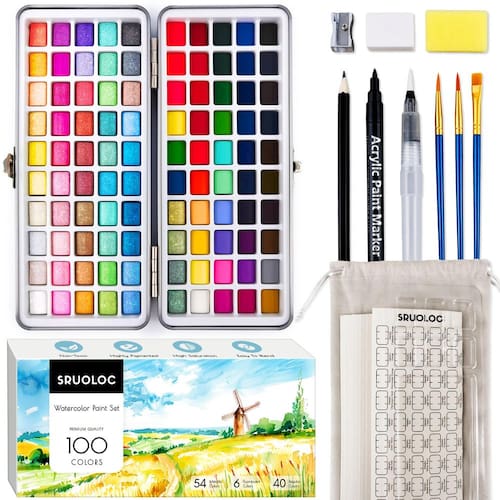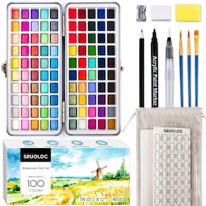 Conjunto de tinta aquarela tudo em um: 100 blocos de cores vivas com estojo de metal portátil para viagem (incluindo: 1 caneta acrílica preta, 1 caneta pincel de aquarela, 3 pincéis, 1 caneta de desenho, 1 apontador de lápis, 1 borracha, 1 esponja, 1 tabela de cores, 1 paleta, 1 bolsa de estação, 8 papel aquarela). Tudo o que você precisa está incluído neste mini conjunto de aquarela. para que você possa criar qualquer tempo, seja viajando ou em casa Conjunto de tinta aquarela de alta qualidade: 54 metálicos + 40 regulares + 6 fluorescentes. As cores são feitas de pigmentos de alta qualidade que são solúveis, fáceis de misturar e têm bom desempenho criativo. Dê vida à sua arte em aquarela. Não tóxico e seguro. Os conjuntos de tintas guache SRUOLOC não são tóxicos. Cada marcador permanente espesso atende aos padrões de segurança ASTM d-4236 e EN-71. Embalagem para presentes: simples e elegante estojo de viagem portátil e bolsa de armazenamento, que pode armazenar todos os itens e também pode ser usada para bricolage, sinta-se à vontade para criar na bolsa e na capa Versátil para todos os artistas: perfeito para artistas em todas as etapas, comece sua jornada criativa com um conjunto de tinta de aquarela SRUOLOC - Conjunto de tinta aquarela tudo em um: 100 blocos de cores vivas com estojo de metal portátil para viagem (incluindo: 1 caneta acrílica preta, 1 caneta pincel de aquarela, 3 pincéis, 1 caneta de desenho, 1 apontador de lápis, 1 borracha, 1 esponja, 1 tabela de cores, 1 paleta, 1 bolsa de stroage, 8 papel aquarela). Tudo o que você precisa está incluído nesta mini aquarela. conjunto, para que você possa criar a qualquer momento, seja viajando ou em casa - Conjunto de tinta aquarela de alta qualidade: 54 metálicos + 40 regulares + 6 fluorescentes. As cores são feitas de pigmentos de alta qualidade que são solúveis, fáceis de misturar e têm bom desempenho criativo. Dê vida à sua arte em aquarela - Não tóxico e seguro: os conjuntos de tinta guache SRUOLOC não são tóxicos, mas atendem aos padrões de segurança ASTM d-4236 e EN-71 - Embalagem para presente: Estojo de viagem portátil simples e elegante e bolsa de armazenamento, que pode armazenar todos os itens e também pode ser utilizado para bricolage, sinta-se à vontade para criar na capa - Versátil para todos os artistas: perfeito para artistas em todas as etapas, comece sua jornada criativa com o conjunto de tinta SRUOLOC aquarela