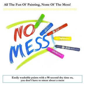 - Tintas laváveis para crianças: Não são necessários copos, batas, água ou pincéis ao usar essas tintas laváveis. Essas canetas de tinta têmpera são facilmente lavadas para que você não precise se preocupar com a bagunça!