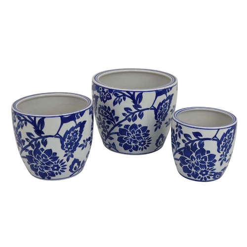 plantadores de jardim, padrão floral de cerâmica japonesa branca e azul - Conjunto de três vasos