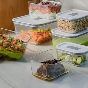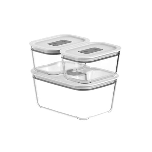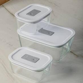 Conjunto de Potes de Vidro Herméticos 3 Peças Fresh Lock OuO kit de potes de vidro hermético acompanha você em todas as etapas no preparo das refeições, suportando temperaturas de até 220C no forno ou air fryer e -20C no freezer. Também podem ser levados ao micro-ondas com a tampa, basta abrir a válvula de respiro. Feitos de vidro borossilicato, um material termo-resistente que evita manchas e odores, são uma escolha durável e segura para armazenar seus alimentos. Totalmente BPA Free, são seguros para o consumo e podem ser levados à lava-louças, tornando a limpeza prática e rápida. Proporcionando uma jornada completa desde o preparo até o armazenamento, estes potes facilitam o seu dia a dia na cozinha.