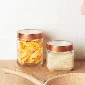 Este conjunto inclui quatro potes de vidro, oferecendo versatilidade no armazenamento e organização na cozinha. Os potes são projetados especialmente para armazenar mantimentos, como grãos, massas, ou outros alimentos secos. As tampas são feitas de metal na cor rose gold, adicionando um toque de elegância e sofisticação ao conjunto.