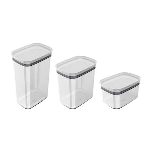 O Conjunto De Potes Herméticos Block Modular 3 Peças é perfeito para auxiliar na organização da sua casa, pois armazena diferentes tipos de alimentos secos. Empilhe, encaixe e enxergue facilmente o conteúdo, mantendo tudo em ordem. Seu design foi pensado para que os potes sejam empilhados e facilmente abertos, com cantos arredondados que proporcionam uma pega confortável e ergonômica. Além de possuir anel de vedação feito em silicone com tecnologia que permite abertura suave e vedação perfeita.