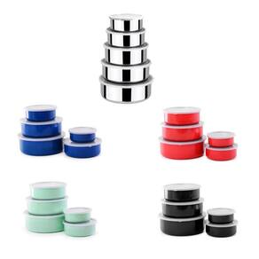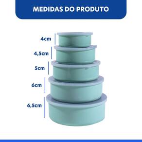 Dimensões e Capacidades: Pote 1: 4 cm x 10 cm A x D , capacidade 250 ml, peso 35g Pote 2: 4,5 cm x 12 cm A x D , capacidade 450 ml, peso 50g Pote 3: 5 cm x 14 cm A x D , capacidade 700 ml, peso 60g Pote 4: 6 cm x 16 cm A x D , capacidade 1 L, peso 80g Pote 5: 6,5 cm x 18 cm A x D , capacidade 1,4 L, peso 99g