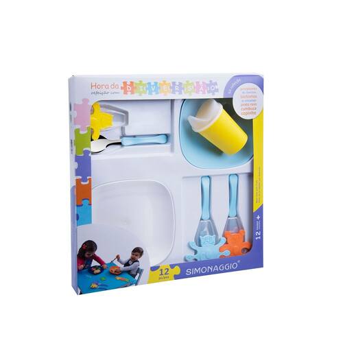 Agora seu filho terá um conjunto só para ele com um cumbuca, prato de sobremesa, colher, garfo, faca e copinho