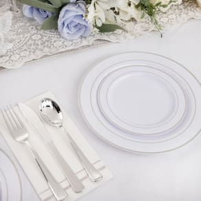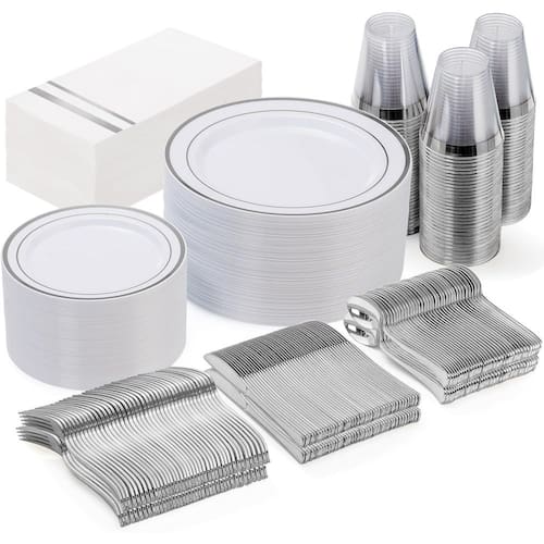 GATHER A coleção de pratos de plástico prateado inclui uma ampla variedade de itens, como pratos descartáveis, garfos de jantar, facas de jantar, colheres de jantar, copos, guardanapos, etc. para atender às necessidades de diferentes ocasiões de jantar. O guardanapo se desdobra tamanho 40 x 33 cm. Nossos pratos descartáveis de prata são lindamente projetados com uma aparência elegante que adicionará um toque de luxo à sua experiência de jantar. Seja uma reunião de família, um jantar formal ou uma ocasião especial, estes pratos de plástico branco e prata complementarão perfeitamente o seu gosto. Somos especializados em fornecer pratos descartáveis da mais alta qualidade e esses pratos de prata são feitos de plásticos de qualidade premium com excelente durabilidade, garantindo que mantenham seu brilho mesmo após uso prolongado. Estes pratos de plástico prateado são projetados para serem descartáveis, eliminando o incômodo de limpar após uma refeição. No final da refeição, basta descartar os pratos descartáveis, facilitando a limpeza pós-jantar e proporcionando mais tempo para você e seus amigos conversarem! Além de serem uma ótima opção para uso doméstico, estes pratos de plástico para casamento também são presentes perfeitos. Se você os der a amigos e familiares ou usá-los como presentes para casamentos, aniversários ou outras ocasiões especiais, esses pratos descartáveis de prata são presentes decentes e memoráveis.