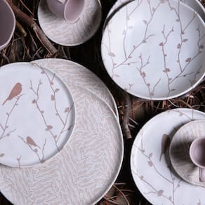A coleção Bio, feita em Cerâmica Stoneware, um material inovador e sustentável, onde a combinação das melhores matérias primas naturais, unido a um processo único de queima e acabamento manual, entregam um produto com características superiores em termos de qualidade e resistência. Podendo ser levados à geladeira, micro-ondas, lava-louças e forno convencional. A leveza das peças fica por conta dos tons claros e neutro já a delicadeza se da por conta da decoração dos passarinhos.