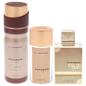 Al Haramain Amber Oud Gold Edition Extreme Conjunto de presente de 3 peças - Colônia de luxo unissex - Perfume para homens e mulheres - Spray EDP de 70 g, spray EDP de 28 g, spray corporal de 187 g