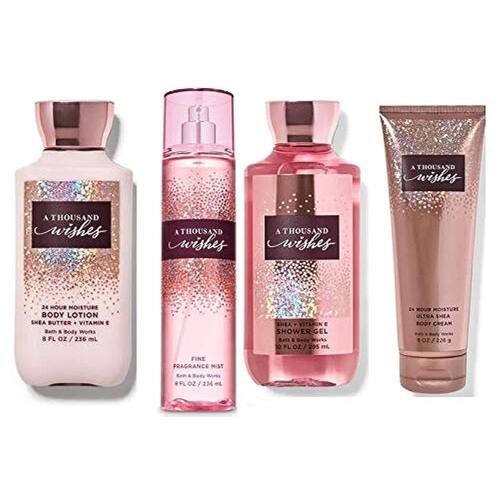 - Conjunto de presentes completo: desfrute de uma experiência luxuosa de mimos com este conjunto de presentes Bath & Body Works A Thousand Wishes em tamanho real, com loção corporal, gel de banho, creme corporal e névoa de fragrância fina