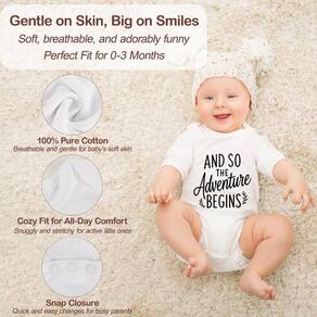 Um body de bebê 100% algodão com estampa "And So the Adventure Begins", ideal para recém-nascidos de 0 a 3 meses.