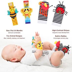 - Brinquedos divertidos para o desenvolvimento do bebê: Inclui meias de chocalho e chocalhos de pulso com características sensoriais que fazem sons divertidos, ótimos para momentos de barriga, brincadeiras ou atividades de aprendizagem precoce do bebê.